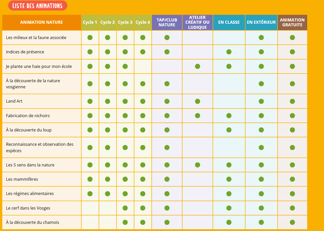 EkolienEkolien (outil d’Éducation à la nature) est un site collaboratif mis gratuitement à votre disposition pour vous permettre de trouver les informations, les photographies ou les vidéos dont vous avez besoin. Il vous permettra aussi de vous renseigner sur une espèce animale sauvage ou un milieu naturel particulier pour vous accompagner dans la construction d'une intervention ou d'un exposé . Les informations proposées ont été soigneusement contrôlées par des spécialistes pour garantir leur qualité et leur actualité. Liste des animations possibles dans les Vosges par nos animateurs :Chaque année, plus de 80 000 élèves, dans un cadre scolaire ou périscolaire, bénéficient des interventions de nos animateurs nature. Sous le contrôle des enseignants et à leur demande, des séquences pédagogiques de découverte de la faune sauvage et des milieux naturels de votre territoire, vous sont proposées. |