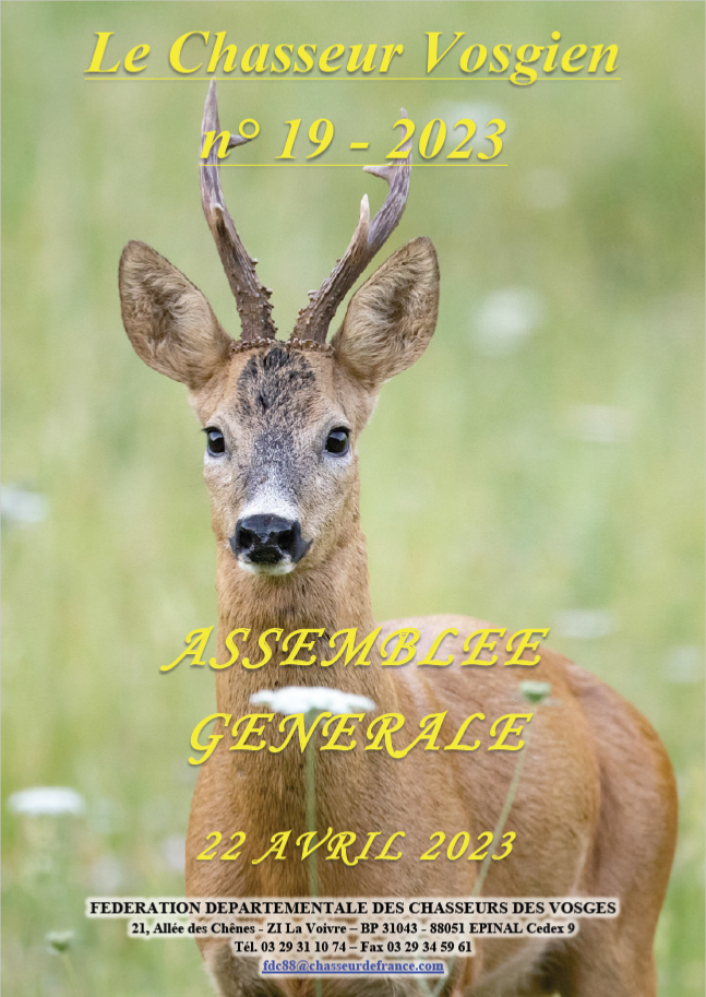 Liste des communes des sous massifs 10A : ALLARMONT, BELVAL, CELLES SUR PLAINE, LUVIGNY, MOUSSEY, MOYENMOUTIER, PETITE RAON (LA), RAON L'ETAPE, RAON SUR PLAINE, SAULCY (LE), VEXAINCOURT, 10B : BAN DE SAPT, CHATAS, DENIPAIRE, FRAPELLE, GRANDE FOSSE (LA), GRANDRUPT, HURBACHE, MENIL DE SENONES, MONT (LE), NAYEMONT LES FOSSES, NEUVILLERS SUR FAVE, PAIR ET GRANDRUPT, PETITE FOSSE (LA), PROVENCHERES ET COLROY, PUID (LE), SAINT DIE DES VOSGES, SAINT JEAN D ORMONT, SAINT STAIL, SENONES, VERMONT (LE), VIEUX MOULIN, VOIVRE (LA). Publié le 25/07/2025 ![]() Chère Amie Chasseresse, Cher Ami Chasseur, Devant les problématiques nationales liées à l’exercice de la chasse et la constante remise en cause de notre passion, la Fédération Nationale des Chasseurs a décidé de réaliser une action nationale. L’idée est de créer un mouvement coordonné dans un maximum de territoires et donc d’envergure nationale pour les médias en allant le samedi 17 mai 2025 à 11h00 dans les mairies pour remettre le manifeste, qui regroupe les revendications de la chasse française. Le maire pourra éventuellement signer en gage de soutien. Nous avons besoin de vous pour cela. La remise du manifeste doit se faire en main propre par le Président ou l'Adjudicataire ou un représentant chasseur de la commune. Vous trouverez ce manifeste accompagné d’un argumentaire ci-dessous. Ce dernier vous permettra lors de la remise du manifeste, d’expliciter tel ou tel point au maire et/ou à ces adjoints. Si la mairie est fermée, et nombre le sont le samedi, rendez-vous peut être pris la veille en priorité ou le lundi. A défaut, le manifeste pourra être déposé dans la boite aux lettres de la mairie. Une photo de la remise devra être prise à cette occasion devant la mairie et renvoyée à la FDC88, par SMS au 06.45.67.59.13 ou par mail à l'adresse suivante : fdc88@chasseurdefrance.com Comptant sur votre engagement ! Le Président, Frédéric TISSIER Publié le 13/05/2025 ![]() La FRC et les FDC s’investissent activement dans la plantation de haies, à travers différents programmes. Ces dernières années, la plantation de haies en Grand Est a bénéficié d’une forte dynamique nationale, favorisant leur retour dans nos paysages. Pauline Wagner, alternante au sein de la FRC GE lance une enquête régionale pour mieux comprendre les freins et leviers à une gestion durable des haies. L’objectif est de mieux comprendre les pratiques actuelles d’entretien des haies et d’identifier les freins à la mise en place de méthodes plus durables. À terme, ces résultats permettront de proposer des outils concrets pour accompagner les gestionnaires et assurer la pérennité des haies. Que vous soyez agriculteur, technicien, prestataire d’entretien ou encore une collectivité, votre expérience compte ! 10 minutes suffisent pour répondre à ce questionnaire et nous aider à proposer des solutions adaptées. Publié le 25/04/2025 ![]() Amies chasseresses, amis chasseurs, La Fédération Départementale des Chasseurs des Vosges a le plaisir de vous convier à notre Assemblée Générale qui se déroulera le samedi 19 avril 2025 à la Rotonde de Thaon-Les-Vosges à 9h. Publié le 03/03/2025 ![]() Modalités de dépôt et de reprise des trophées de cerfs et chamois Retrouvez les modalités de dépôt et de retrait des trophées pour l'exposition des trophées le 19 et 20 avril 2025. Publié le 19/02/2025 Opération J'aime La Nature Propre Découvrez l'annonce de notre évènement "J'aime la nature propre" en avant première sur le site de notre partenaire Magnum la Radio ! Prochainement vous pourrez aussi découvrir le spot à leur radio. Publié le 11/02/2025 Formation Brevet Grand Gibier Afin de compléter vos connaissances cynégétiques, l'AGAGG (Association pour la Gestion et l'Amélioration du Grand Gibier) vous propose une formation beaucoup plus approfondie dans les domaines de l'éthologie des grands gibiers, des armes, de la réglementaion, de la forêt ou encore de la petite faune. Publié le 06/02/2025 Recyclez vos douilles de fusil et carabine ! Dans le cadre d'un partenariat avec l'entreprise EcoLogic, la Fédération tient à votre disposition, dans ses locaux à Epinal, des bacs de récupération des douilles de fusil et carabine, quelles soient triées ou mélangées. Vous trouverez également deux autres sites de depôt situés :