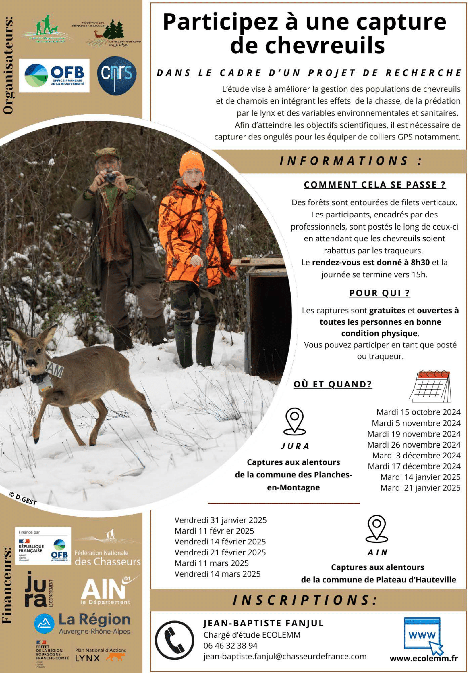 Enfin, nous profitons de cette communication pour, à nouveau, vous informez de l’augmentation très significative des dégâts agricoles observés sur le département et vous demandons de maintenir une pression de chasse importante toute cette saison. Comptant sur vous, Le Président, Frédéric TISSIER Publié le 28/11/2024 La FNC et la SNCF sensibilisent les chasseurs aux risques ferroviaires Dans la cadre de la convention entre la SNCF Réseau et la FNC, un flyer a été élaboré pour rappeler les risques que prennent les chasseurs en pénétrant sur une emprise ferroviaire. Aussi, ce flyer rappel l'importance de respecter les règles de sécurité, notamment en ce qui concernant l'accès interdit de certaines zones. Vous y retrouverez également des conseils pratiques et des consignes de sécurité, ainsi que des rappels sur les sanctions en cas d'infraction. Publié le 14/11/2024 ![]() Inscrivez-vous à la formation sécurité décennale Depuis 2020, chaque chasseur doit suivre une remise à niveau décennale obligatoire portant sur les règles élémentaires de sécurité, selon un programme défini par la Fédération Nationale des Chasseurs. Si vous n'avez pas encore suivie cette formation, consulter les modalités d'inscription au lien suivant : http://www.federationchasseur88.fr/PBCPPlayer.asp?ID=2422581 Publié le 31/10/2024 ![]() Bilan des prélèvements d'ongulés sauvages pour la saison 2023-2024 A la fin de chaque saison de chasse, le réseau Ongulés sauvages OFB-FNC-FDC publie une synthèse des prélèvements de grand gibier consultable sur le site internet de l'Office Français de la Biodiversité : https://www.ofb.gouv.fr/les-especes-chassables. Les synthèses des saisons précédentes y sont également consultables. Publié le 18/10/2024 Reprise de chevreuils dans le Jura Dans le cadre de l’Étude Chasse Ongulés Lynx au sein d'un Ecosystème de Moyenne Montagne (ECOLEMM), la Fédération Départementale des Chasseurs de l'Ain et la Fédération Départementale des Chasseurs du Jura, en partenariat scientifique avec l’Office français de la biodiversité et le CNRS, organise des journées de captures de chevreuils. Si vous êtes intéressés pour participer, contactez :