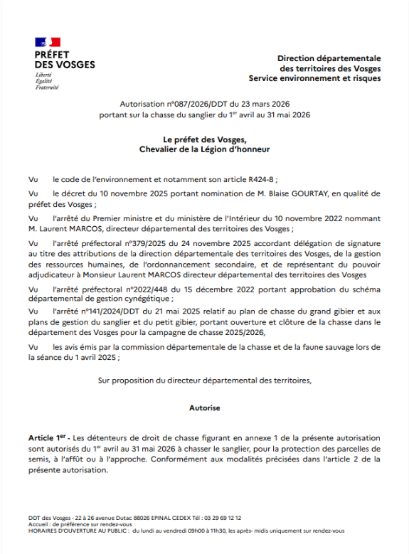 Association agréée au titre de la protection de la natureACTU DU MOISDemandes d'autorisations de destruction à tir Comme chaque année, vous avez la possibilité d'effectuer une demande d'autorisation de destruction à tir pour les corvidés pour la santé et la salubrité publique et pour la protection des semis agricoles. Tout se fait en ligne en cliquant sur le lien c-dessous et en vous connectant avec votre compte France Connect. Attention, pensez à retourner le bilan de chaque autorisation après la date de fin pour bénéficier de l'obtention de l'autorisation l'année suivante. Perturbations d'accès suite au début des travaux de rénovation énergétique de votre Fédération Lors de cette période, le parking au sein de la Fédération n'est pas ouvert aux véhicules, veuillez vous garer à l'extérieur. L'accueil reste accessible pour les piétons et une sonnette est mise à disposition au niveau du portail pour les personnes à mobilité réduite (PMR). Nous mettons tout en œuvre pour maintenir l'ensemble des services actifs pendant cette phase d'amélioration de vos locaux. ![]() Date de fin d’agrainage dissuasif pour 2025 : ![]() La formation Spécialisée Dégâts de Gibier de la CDCFS qui fixe les dates limites d’enlèvement des différentes récoltes, a été consultée mi-novembre pour étudier les barèmes céréales et pour fixer ces dates limites concernant toutes les cultures pour 2025. La date extrême a été fixée au 15 décembre 2025 pour six cultures, dont le maïs ensilage et le grain. C’est donc cette date qui fait foi pour l’arrêt de l’agrainage cette saison. Le dernier jour d’agrainage pour le département des Vosges, conformément au SDGC, sera donc le lundi 15 décembre 2025 (inclus). Cette date s’applique donc pour tous les contrats validés pour cette année. Pour l’ensemble des contrats validés, la reprise de l’agrainage pourra s’effectuer qu’à partir du 15 mars 2026, comme prévu par le SDGC. Les jours d’agrainage étant uniquement les lundis et jeudis, le premier jour d’agrainage sera donc le lundi 16 mars 2026. Nous vous rappelons :